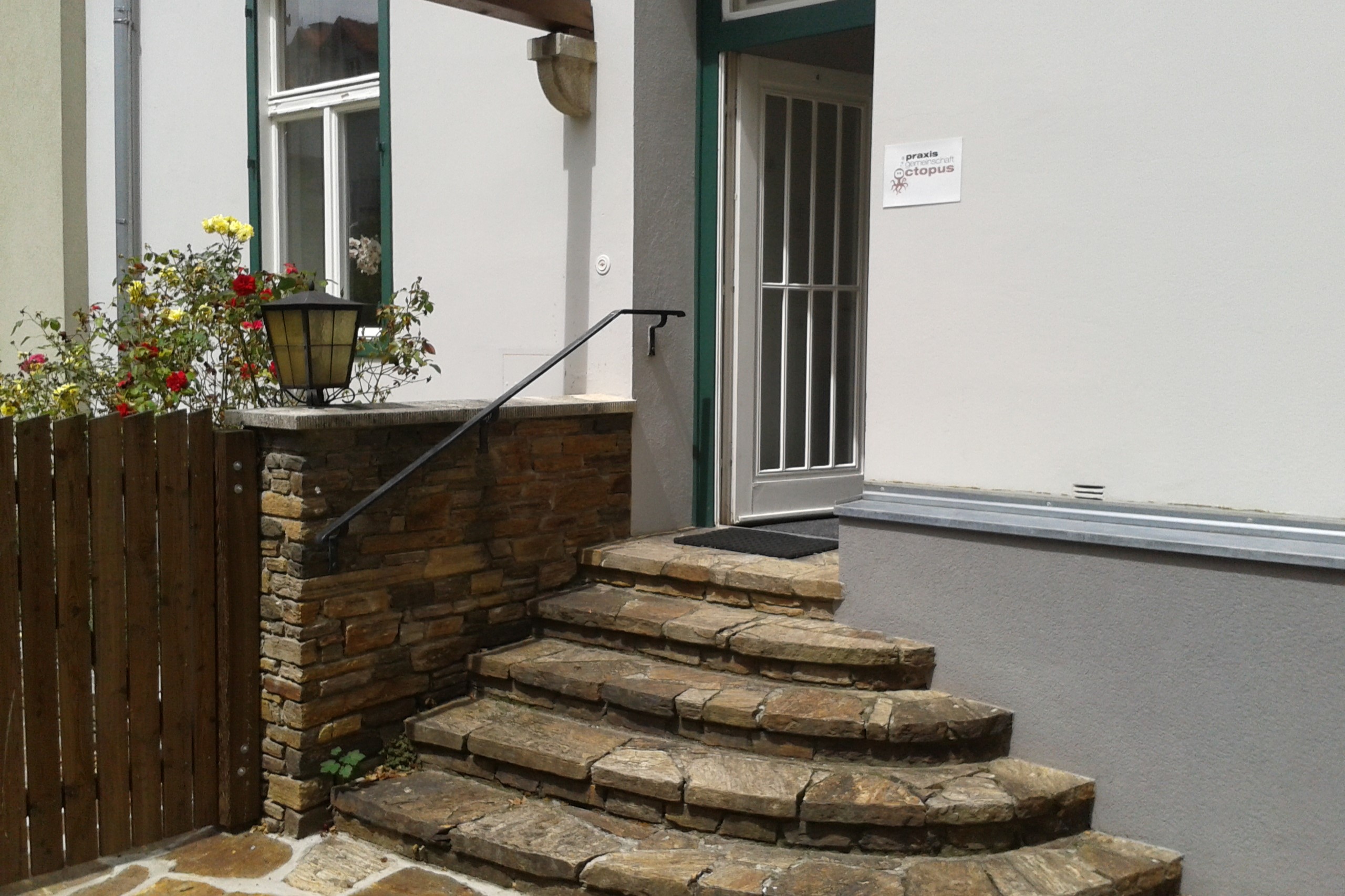 Der Zugang zur Praxisgemeinschaft Octopus in Graz befindet sich ruhig gelegen im Innenhof der Laimburggase 19. Die Räumlichkeiten werden über fünf Stufen mit einem Handlauf auf der linken Seite erreicht (siehe Bild). Innerhalb der Praxis sind alle Räume ebenerdig zu begehen.